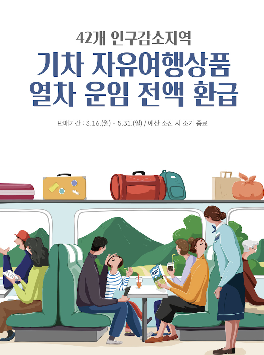 한편, 우리나라의 철도를 담당하는 코레일에서는 42개의 인구감소지역의 자유여행상품을 구입하면 기차운임료의 100%를 코레일톡 포인트로 환급해주는 사업을 진행하고 있어요.