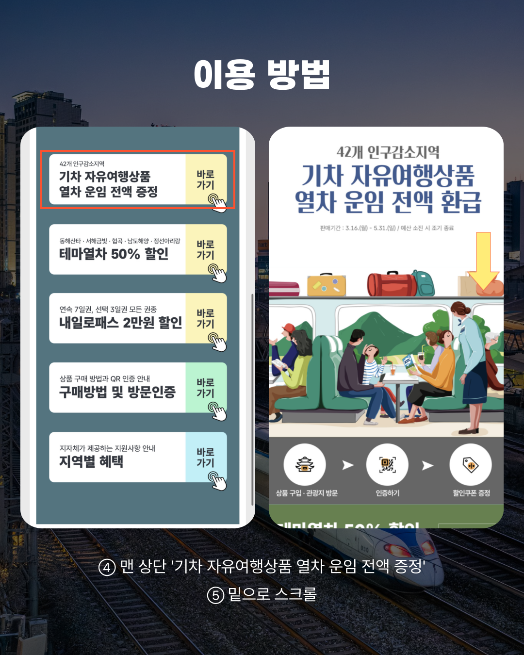 로그인 후 여행상품·패스 탭에서 '기차 자유여행상품 열차 운임 전액 증정'에서 기차표를 구매해야 해요.
